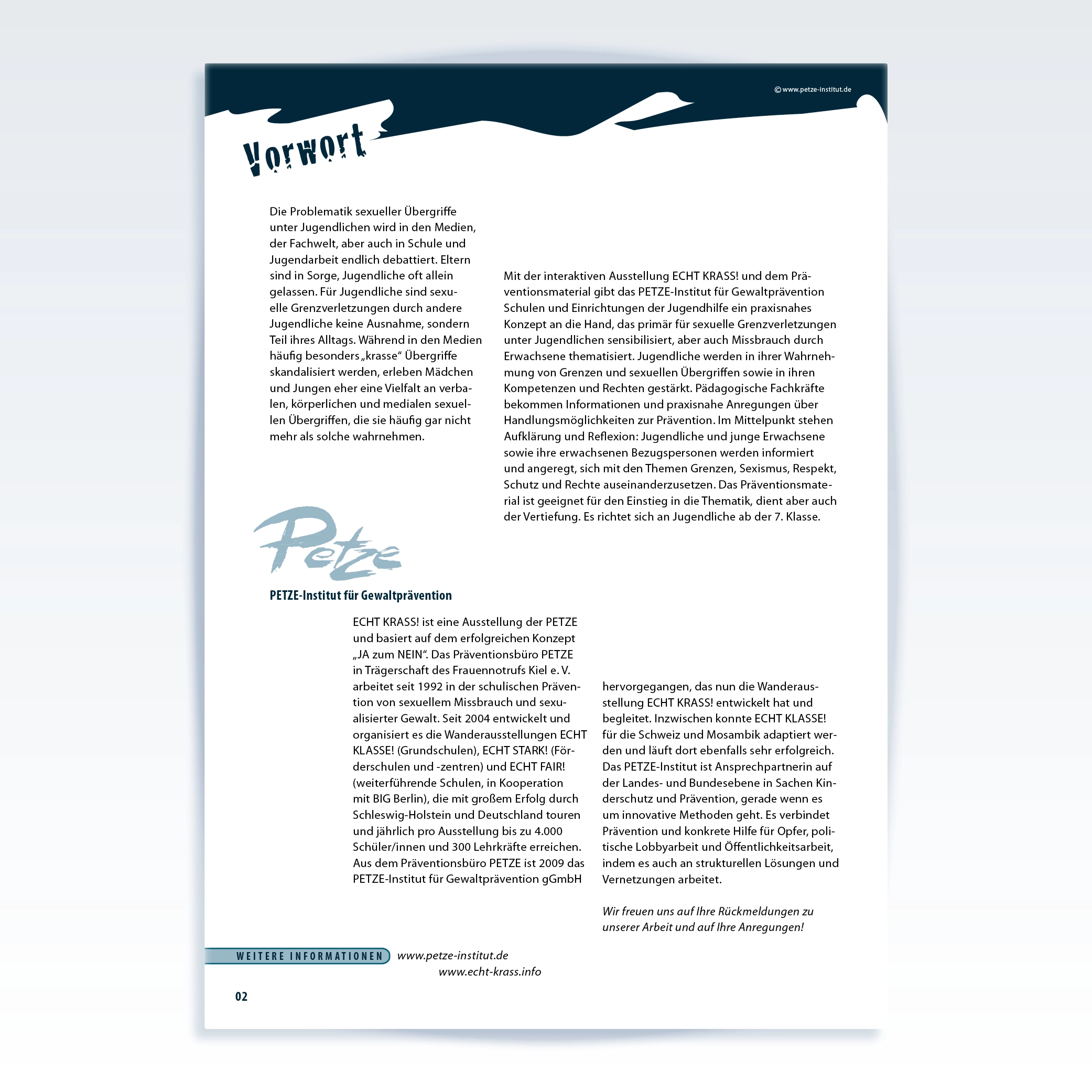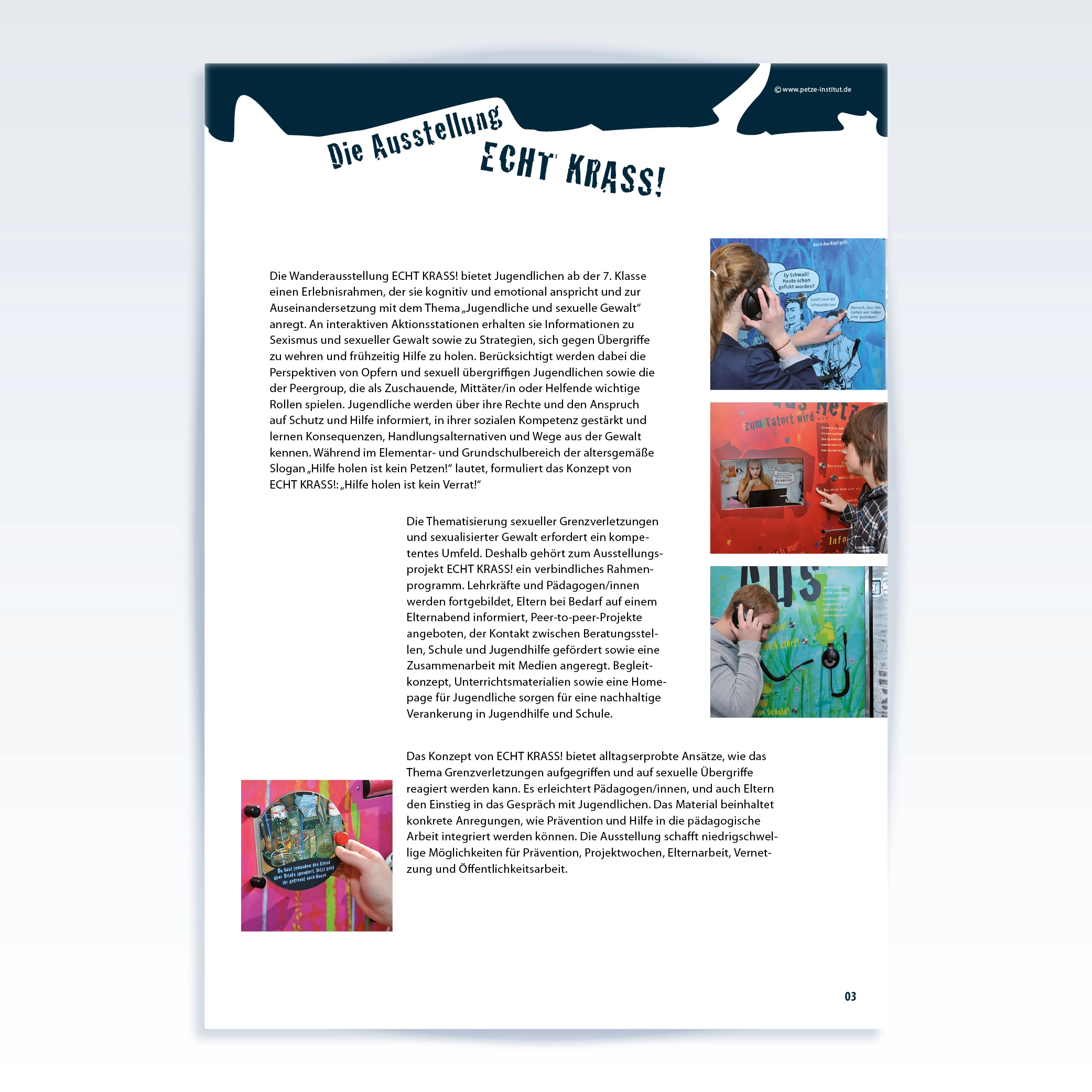 Mit der interaktiven Ausstellung ECHT KRASS! und dem begleitenden Präventionsmaterial sensibilisiert das PETZE-Institut für Gewaltprävention Schulen und Jugendhilfe für sexuelle Grenzverletzungen unter Jugendlichen. Jugendliche werden in ihrer Wahrnehmung von Grenzen und sexuellen Übergriffen sowie in ihren Kompetenzen und Rechten gestärkt. Pädagogische Fachkräfte bekommen Informationen und praxisnahe Anregungen über Handlungsmöglichkeiten zur Prävention.